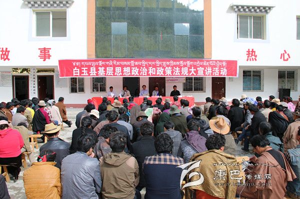 ?。冈碌陌子瘢胰债?dāng)頭,秋高氣爽。31日上午,絨蓋鄉(xiāng)政府大院內(nèi),白玉縣基層思想政治和政策法規(guī)大宣講活動(dòng)正在這里精彩“上演”,400多名前來(lái)“聽課”的各村群眾正津津有味地品味著縣宣講團(tuán)成員松吉尼瑪通俗易懂的藏語(yǔ)大宣講。從黨的十八大到十八屆三中全會(huì)精神,從糧食直補(bǔ)到低保、新農(nóng)保,從養(yǎng)老保險(xiǎn)、殘疾人幫扶到相關(guān)法律法規(guī),宣講者深入淺出,傾聽者全神貫注。