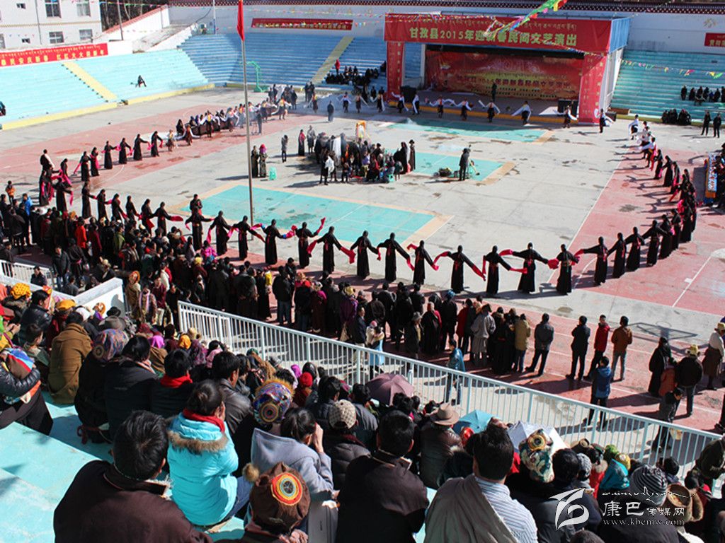 2月21日和22日,甘孜縣中心體育廣場彩旗獵獵,歌舞歡騰,由中共甘孜縣委、縣人民政府主辦,縣委宣傳部、縣文旅廣體局承辦的2015年新春民間文藝演出在這里隆重舉行,來自團(tuán)結(jié)村和瓦巴村的藏族群眾穿上節(jié)日的盛裝,跳起歡快的鍋莊弦子,共慶新年。