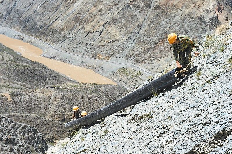 為解決曲雅貢鄉(xiāng)因都?jí)未?200畝農(nóng)田水管老化漏水、灌溉困難的問題,得榮縣今年4月啟動(dòng)了“農(nóng)業(yè)灌溉節(jié)水工程”,需要通過人工從12公里遠(yuǎn)的水源地——真康壩取水點(diǎn),用管道把水引到因都?jí)未?。完成這一引水工程,工人們要在金沙江畔陡峭的懸崖峭壁之上鋪設(shè)一條“空中水路”。據(jù)悉,該工程預(yù)計(jì)今年10月完工。