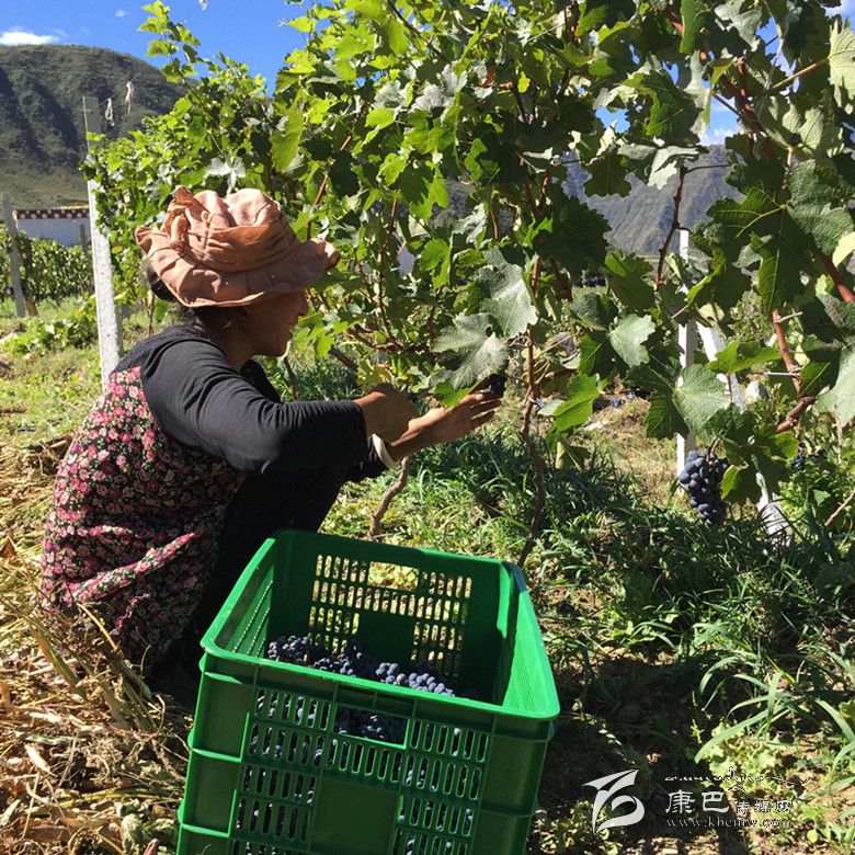丹巴農(nóng)家女在采摘釀酒葡萄。