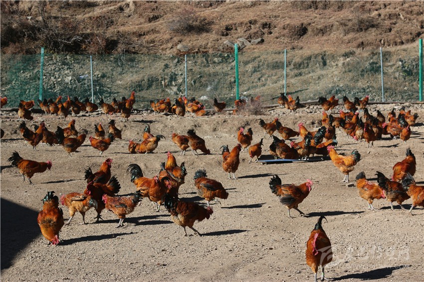 雄雞啼鳴鬧山谷,灣地溝村喜脫貧。12月9日上午10時(shí)許,當(dāng)記者沿著通村水泥路來到距雅江縣城20多公里的呷拉鎮(zhèn)灣地溝村紅標(biāo)雞生態(tài)養(yǎng)殖基地時(shí),只見冬日暖陽下的洼谷山半山坡上,成群結(jié)隊(duì)的大紅公雞正在樹林下或覓食或展翅或歡歌。飼養(yǎng)員告訴記者:“別小看這3000多只活潑可愛的跑山雞,那可是村民心中的‘財(cái)富金雞’!”
