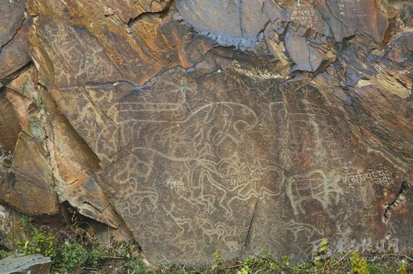 省考古院李飛介紹,其中一處巖畫上,還能看到古藏文的題記。這些圖像均為密點鑿刻,創(chuàng)作者先用細線在崖壁上刻劃出輪廓,再通過密點敲鑿出圖像。它們中,有的是通體剪影式,有的則是粗線條輪廓式。