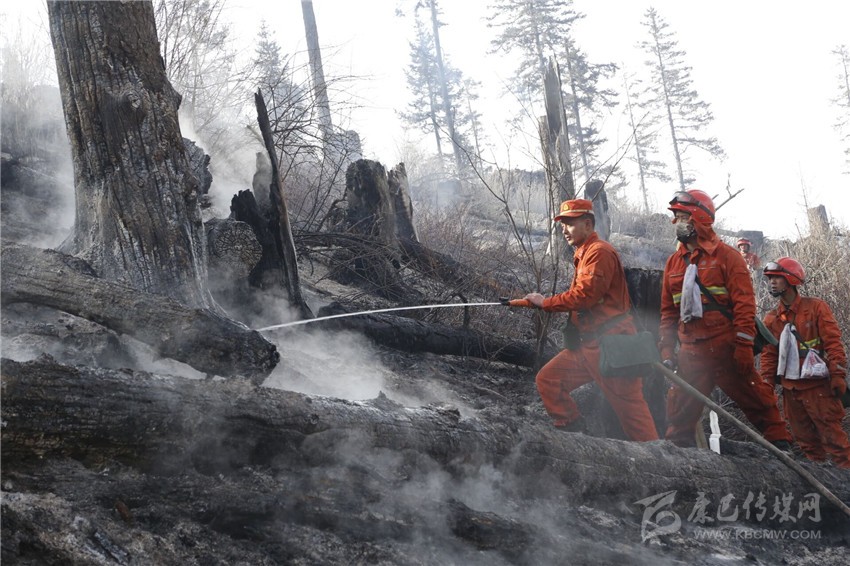 2月10日,火頭蔓延至火場東北一線,參戰(zhàn)官兵發(fā)現(xiàn)幾處被冰雪覆蓋的水源,火場前指決心改變戰(zhàn)法,采用7組水泵串聯(lián)接力向火場供水主攻明火,常規(guī)機具輔助配合消除煙點的方式,將部隊分為水泵和常規(guī)機具兩個梯隊,在火場火勢最為猛烈的東北側(cè)展開滅火作戰(zhàn)。參戰(zhàn)官兵用自身攜帶的鍬鎬奮力破冰面抽水,在水泵的助力下,明火得到了有效壓制并逐步熄滅。隨后,部隊和地方群眾全部轉(zhuǎn)入火場清理看守階段。