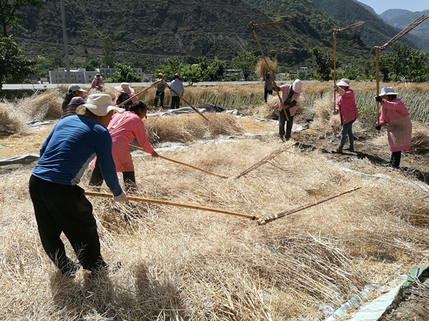 本網(wǎng)訊(尼胡克布 李娟 /圖)512日,在瀘定縣德威鄉(xiāng)下河壩村農(nóng)田里,村民李永強(qiáng)正組織親戚朋友20余人,對自家3畝多油菜進(jìn)行搶收。村民們有的負(fù)責(zé)把一捆捆曬干的油菜抱到油布上,有的負(fù)責(zé)用農(nóng)具進(jìn)行打籽,現(xiàn)場一派繁忙的景象。