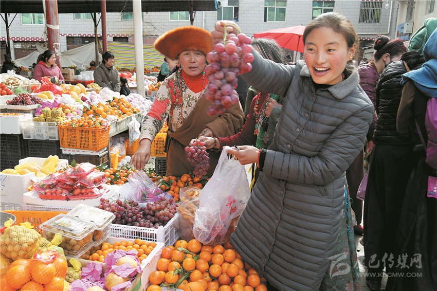 新都鎮(zhèn)格色村的丹真大哥和老伴兒其吉牽著8歲的孫子正在干果店里挑選各類干果,身后的背簍里水果、蔬菜、酥油、牛肉等農(nóng)畜產(chǎn)品以及中國(guó)結(jié)、年畫、對(duì)聯(lián)、掛圖等吉祥的節(jié)日物品應(yīng)有盡有。