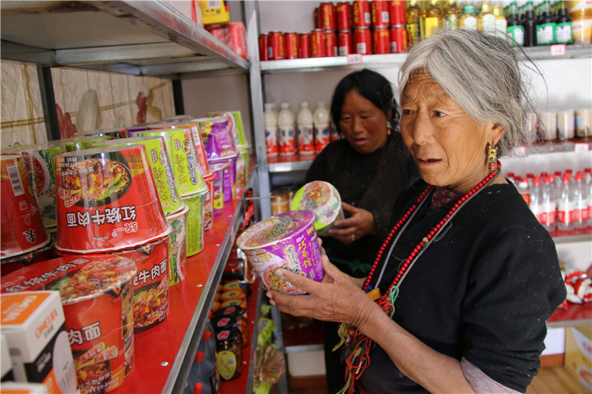 貨架上的貨物琳瑯滿目,價格與縣城大超市一分不差,還節(jié)省了路途奔波?!凹议T口就能買到東西,還又好又便宜,安逸。開展精準(zhǔn)扶貧,硬是為大家解決了大困難?!?村民格瑪拉措道出了村民們的感激。大家共同商議決定把這超市叫做“洛蝦村感恩超市”。