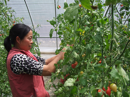 “盛煌公司來這里開展蔬菜大棚建設(shè)以后,每畝每年按照1500元的標(biāo)準(zhǔn)支付了村民的土地流轉(zhuǎn)租金。我是外地嫁到這里來的,沒有土地,他們雇傭我來務(wù)工,每個月按照1800元支付我的工資,每個月還可以休息兩天。”正在大棚里摘水果番茄的村民陳國蓉知足地說。