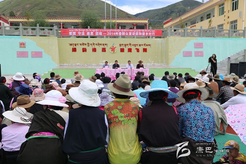 “2014州委群眾宣講團和諧鄉(xiāng)村行”宣講團9月11日下午來到道孚縣格西鄉(xiāng),在格西鄉(xiāng)中心校內(nèi),群眾們早早到來,盤腿坐在塑膠跑道上,認真聽州民干校高級講師仁志降澤用藏文講述的一個又一個通俗易懂的小故事,感知“愛國 守法 感恩 團結(jié)”八個字。他還結(jié)合具體實例講述法律、交通方面知識,大家聽得聚精會神,時而被降澤老師的小故事逗的捧腹大笑,時而陷入了深深的思考。