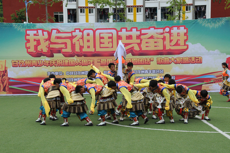 活動(dòng)中,同學(xué)們先后演唱了《黃河頌》、《我愛您,中國!》、《夢圓中國》等多首紅色經(jīng)典歌曲。你方唱罷我登場,現(xiàn)場氣氛熱烈,高潮迭起。優(yōu)美的歌聲唱出了我青少年的愛國情懷,一面面飄揚(yáng)的紅旗表達(dá)著對(duì)祖國的深情祝福。來自州職業(yè)技術(shù)學(xué)校、四川民族學(xué)院、省藏校、甘孜衛(wèi)校、州青聯(lián)委員以及我州著名歌手共1000多人放聲高歌,共同慶祝新中國成立65周年華誕。