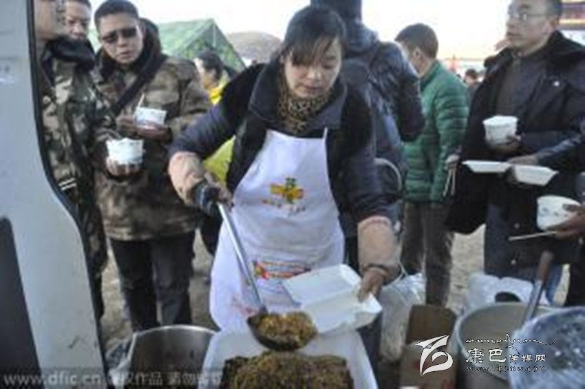 據(jù)了解,韓大哥是這家飯店的老板之一,他是仁壽縣人,幾年前和朋友來到新都橋開始經(jīng)營飯店。康定6.3級地震發(fā)生時,他人在成都。但看到災(zāi)情發(fā)生,韓大哥立即和飯店另外幾個合伙人決定到安置點(diǎn)免費(fèi)送盒飯,“我在當(dāng)?shù)刈隽?、7年生意,現(xiàn)在出了事情,就應(yīng)該伸手支援嘛!”據(jù)韓大哥介紹,此次地震發(fā)生后,新都橋80%左右的飯店都已經(jīng)關(guān)門,他們的飯店因?yàn)檫€有一些接待工作,仍在正常營業(yè)。自11月23日晚上,他家的飯店就主動為塔公鎮(zhèn)的安置點(diǎn)免費(fèi)派送盒飯,“包括中午和晚上兩頓,兩葷兩素一湯的配置。”因?yàn)樘?, 韓大哥來不及仔細(xì)統(tǒng)計(jì),他大概知道每天送出的盒飯?jiān)?200盒到1500盒之間,每天送出盒飯的成本在4、5千左右。但在他看來,這些其實(shí)都算不上什么,“能為災(zāi)區(qū)出一份力,我們就很滿足了,我們打算一直送到抗震救災(zāi)工作結(jié)束,也就是直到災(zāi)民有條件自己做飯的時候。”“這邊天氣很冷,他們吃的一般是些面包、牛奶之類的干糧,我們就是想讓大家吃到熱飯、熱菜。”據(jù)韓大哥介紹,每天飯店都會派出3、4個人將盒飯運(yùn)送到安置點(diǎn),“只要有人需要我們都會分發(fā)盒飯,包括一些志愿者和武警官兵也吃我們的飯。
