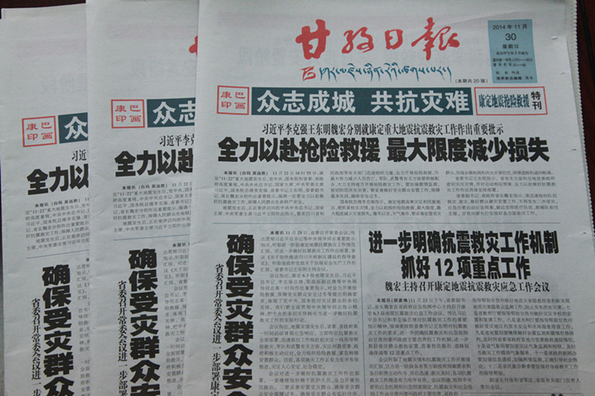 又訊 此外,自康定地震發(fā)生以來,本報藏漢文報廣大編采人員發(fā)揚連續(xù)作戰(zhàn)的精神,已經(jīng)連續(xù)9天不分白天黑夜地工作,保證了一線有記者的身影,后方編輯及時發(fā)聲,截止30日,本報藏漢文報已經(jīng)出版13期《眾志成城 共抗災(zāi)難》專刊和一期特刊,共計72個版面;本報《康巴傳媒網(wǎng)》自開辦網(wǎng)站以來,首次實現(xiàn)了網(wǎng)站信息即時更新、滾動發(fā)布,網(wǎng)站日上稿量超過100條,日點擊量均超過10萬人次;本報微信平臺則采用短平快的方式,第一時間發(fā)布最新資訊,引導(dǎo)公眾情緒,傳播黨委政府的聲音,微信日點擊和轉(zhuǎn)發(fā)量超過2萬人次;除此之外,本報承辦的手機報也發(fā)揮了巨大的作用。