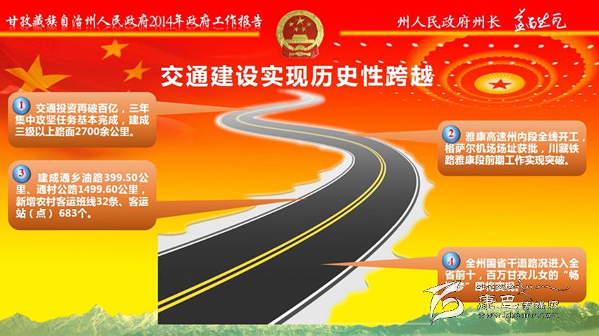 交通建設(shè)實(shí)現(xiàn)歷史性跨越。交通投資再破百億,建成三級(jí)以上路面2700余公里。雅康高速州內(nèi)段全線開工,格薩爾機(jī)場(chǎng)場(chǎng)址獲批,川藏鐵路雅康段前期工作實(shí)現(xiàn)突破。建成通鄉(xiāng)油路399.5公里、通村公路1499.6公里,新增農(nóng)村客運(yùn)班線32條、客運(yùn)站(點(diǎn)) 683個(gè)。全州國省干道路況進(jìn)入全省前十。徹底告別無電鄉(xiāng)歷史。完成投資100億元,“電力天路”等項(xiàng)目順利實(shí)施,“川藏聯(lián)網(wǎng)” 工程提前半年建成投運(yùn);18個(gè)縣實(shí)現(xiàn)與主網(wǎng)連網(wǎng);“遠(yuǎn)村點(diǎn)亮”全面完成。城鄉(xiāng)面貌煥然一新。堅(jiān)持建好縣城,全州市政基礎(chǔ)設(shè)施有效提升。堅(jiān)持做大集鎮(zhèn),改造小城鎮(zhèn)危舊房1118戶;投入1.34億元完善姑咱、馬尼干戈、香格里拉、八美4個(gè)省級(jí)“百鎮(zhèn)試點(diǎn)”鎮(zhèn)市政設(shè)施,13個(gè)鄉(xiāng)獲準(zhǔn)撤鄉(xiāng)建鎮(zhèn)。堅(jiān)持做美村寨,成功創(chuàng)建45個(gè)省級(jí)“美麗鄉(xiāng)村”示范村,19個(gè)州級(jí)幸福美麗新村試點(diǎn)建設(shè)全面啟動(dòng),打造新村聚居點(diǎn)235個(gè),建成藏區(qū)新居1.11萬戶。全州城鎮(zhèn)化率達(dá)到27%。通信覆蓋越來越廣。完成投資4.53億元,國省干線和主要旅游景區(qū)通信網(wǎng)絡(luò)實(shí)現(xiàn)連續(xù)覆蓋。生態(tài)底色更加鮮明。編制完成《甘孜州生態(tài)文明建設(shè)規(guī)劃》,落實(shí)國家生態(tài)功能區(qū)轉(zhuǎn)移支付資金6.8億元,生態(tài)保護(hù)與建設(shè)工程加快推進(jìn),草原植被、森林覆蓋率分別達(dá)到78%、33.04%。