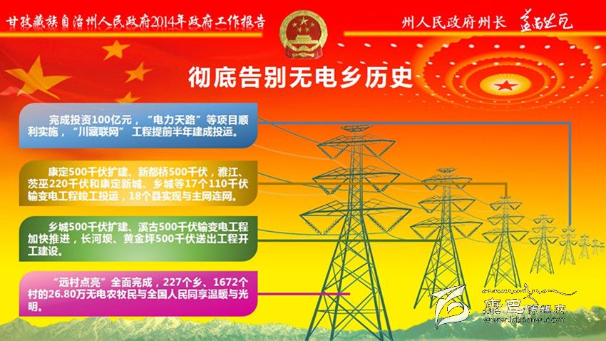 大力推進(jìn)電力通信建設(shè)。投入20億元,加快實(shí)施“電力天路”、無電地區(qū)電力建設(shè)新增項(xiàng)目和農(nóng)網(wǎng)改造升級(jí)工程,切實(shí)緩解邊遠(yuǎn)地區(qū)群眾缺電問題;完成長河壩電站500千伏等3個(gè)輸變電項(xiàng)目;統(tǒng)籌抓好表后入戶工程,確保群眾安全用電。投入6億元,新建通信光纜2360公里、基站1025個(gè),解決國省干道、旅游景區(qū)景點(diǎn)信號(hào)盲區(qū);新增30個(gè)自然村通電話、545個(gè)行政村通寬帶,出口總帶寬達(dá)到82G。