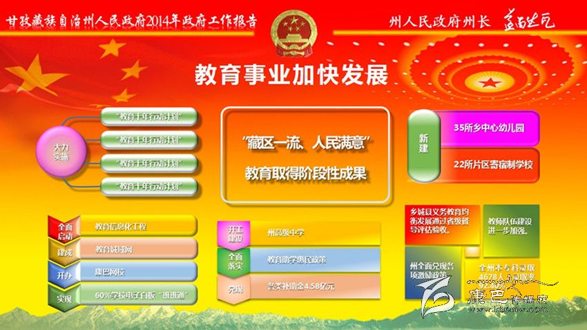 加大民生投入,全年民生支出139億元。全州城鎮(zhèn)新增就業(yè)7400人,城鄉(xiāng)低保實(shí)現(xiàn)應(yīng)保盡保;在全省民族地區(qū)率先實(shí)施醫(yī)療保險(xiǎn)制度城鄉(xiāng)統(tǒng)籌,異地就醫(yī)即時(shí)結(jié)算全面啟動(dòng);在全省率先出臺(tái)大病醫(yī)療保險(xiǎn)規(guī)定。教育事業(yè)加快發(fā)展。新建35所鄉(xiāng)中心幼兒園、22所片區(qū)寄宿制學(xué)校,州高級(jí)中學(xué)開工建設(shè)。全面落實(shí)教育助學(xué)惠民政策,兌現(xiàn)各類補(bǔ)助金4.58億元。城鄉(xiāng)居民基本醫(yī)保參保率達(dá)到99.13%,健康檔案建檔率達(dá)到92%;開工建設(shè)120個(gè)標(biāo)準(zhǔn)化鄉(xiāng)(鎮(zhèn))衛(wèi)生院和225個(gè)村衛(wèi)生室;衛(wèi)生信息化建設(shè)一期工程和遠(yuǎn)程會(huì)診、教學(xué)系統(tǒng)建設(shè)基本完成;兌現(xiàn)計(jì)劃生育“三項(xiàng)惠民制度”資金1809萬元。群眾文化生活日益豐富。建成縣“兩館”12個(gè);開工建設(shè)州民族體育館、州農(nóng)牧民演藝培訓(xùn)中心和14個(gè)縣級(jí)全民健身中心,建成農(nóng)民體育健身工程739個(gè);開展 “送文化下鄉(xiāng)”近千場(chǎng);康巴文化研究院“四大工程”全面啟動(dòng)。深入實(shí)施“百千萬康巴英才工程”,人才科技工作扎實(shí)有效。扶貧移民工作成效明顯。完成1360個(gè)貧困村、19.91萬扶貧對(duì)象立卡建檔工作;實(shí)施整村推進(jìn)63個(gè)、連片開發(fā)項(xiàng)目4個(gè)、彝家新寨(村)17個(gè)、索改橋23座,易地扶貧搬遷9850人,2.65萬群眾生產(chǎn)生活條件得到改善。