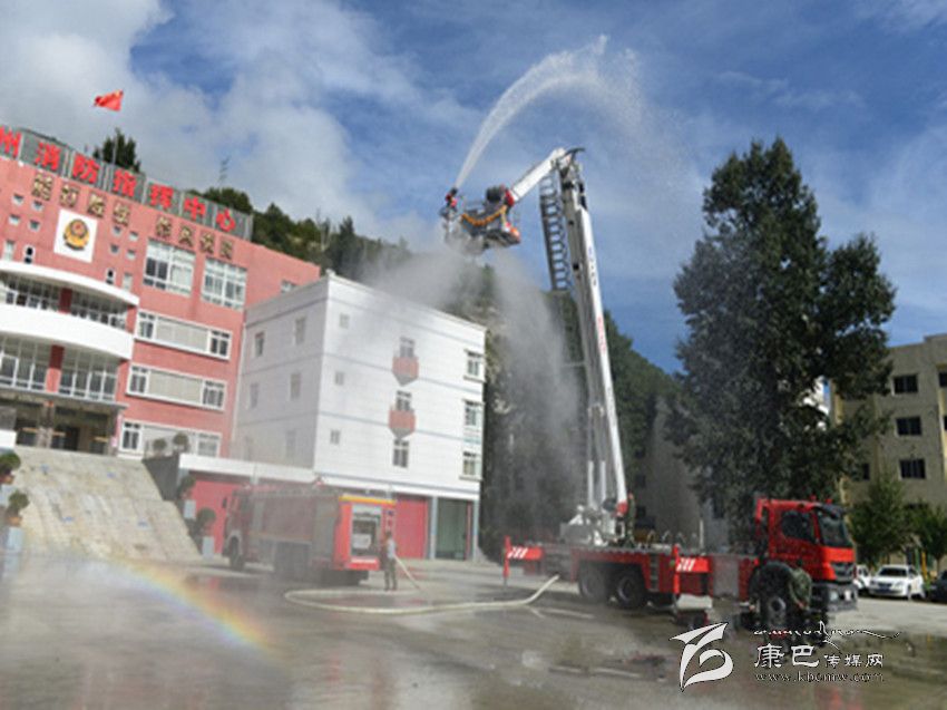 本網(wǎng)訊(劉國謙文/圖)9月8日上午,甘孜消防支隊(duì)操場衛(wèi)聳立著一道“銀色天梯”,筆者在現(xiàn)場目擊了 DG-32C登高平臺消防車的變形過程。隨著 4個支撐架的展開,車體被架離地面,登高平臺臂緩緩上升,如“擎天柱”般伸向云端。在兩名駕駛員的配合操作下,平臺頂端配載的水炮噴射出一條長長的水龍,隨著水壓漸漸加大,奔騰的水龍帶著一道彩虹劃過高空,成為云端深處一道壯觀的麗景。