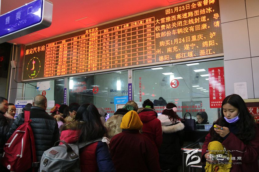 23日晚,康定下了一場鋪天蓋地的大雪,氣溫驟降,但這并沒有影響人們對回家的渴望。記者一進汽車站就看見購票窗口、行李檢查口、車票驗核口井然有序的排滿了購票的旅客。