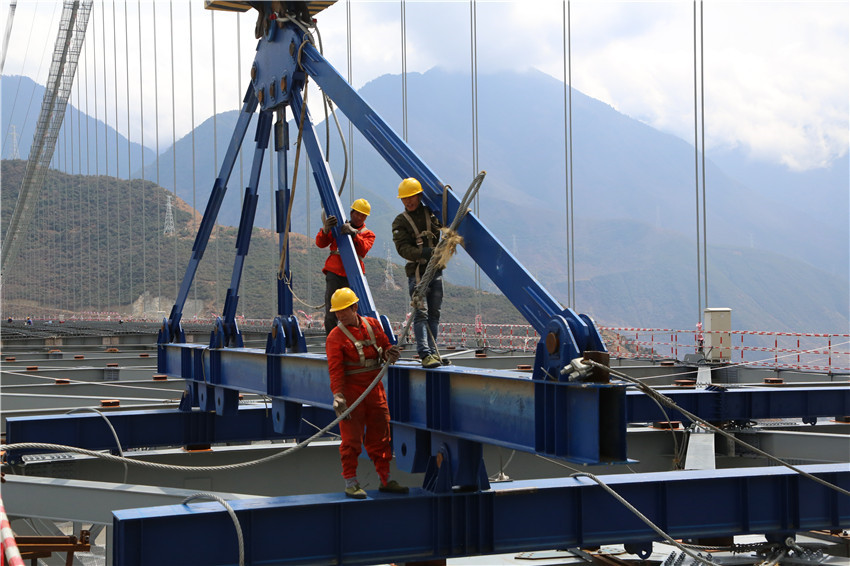 興康特大橋作為高海拔、高地震烈度山區(qū)和復(fù)雜風(fēng)場環(huán)境下世界第一超大跨徑鋼桁梁懸索橋,面臨的最現(xiàn)實(shí)的困難就是復(fù)雜風(fēng)場。4月1日下午,大橋建設(shè)現(xiàn)場連綿不絕的大風(fēng)如期而至,工人們系上安全繩,迎著大風(fēng),對新吊裝的材料一個螺絲一個螺絲的擰緊。