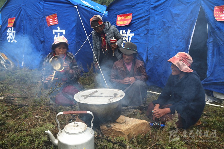 曲珍、曲西和幾個伙伴正在燒著開水?!斑@是到安置點后我第一次生火。前兩天吃干糧喝礦泉水,讓喝慣了酥油茶的我們很不適應(yīng)?!鼻湔f。