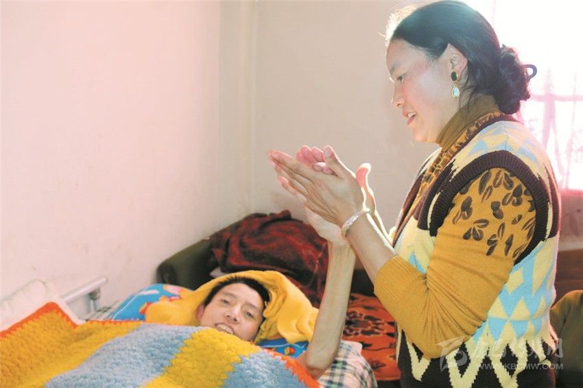 因為根絨的意外事故,家里沒有了經(jīng)濟來源。巨大的經(jīng)濟壓力,讓白措喘不過氣來。但她沒有向命運低頭,撫育3個孩子,就近務工掙錢補貼家用。同時,利用工作間隙回家,照顧丈夫吃飯,給他翻身,換洗沾滿屎尿的墊布……因為擔心丈夫久臥生褥瘡和肌肉萎縮,白措每隔3小時就要給丈夫翻身,還自學了一套按摩手法替根絨全身按摩。在她的精心照料下,根絨身體慢慢得到了康復。