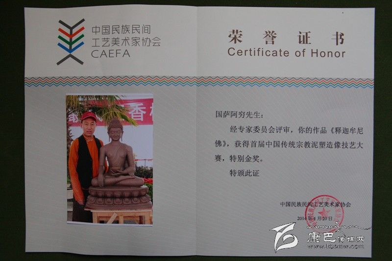由中國民族民間工藝美術(shù)家協(xié)會主辦的“首屆中國宗教泥塑技藝大賽”,旨在傳承宗教泥塑造像技藝,搭建宗教造像藝術(shù)家展示平臺。本次大賽共有來自臺灣、香港、天津、河北、四川、西藏、云南、浙江、江蘇、貴州、江西、寧夏、江西等地的39名泥塑高手現(xiàn)場制作,角逐獎項。我州的國薩阿窮等三名藝人現(xiàn)場制作的泥塑作品《釋迦牟尼》榮獲特別金獎,同時,國薩阿窮還榮獲了“中國傳統(tǒng)工藝美術(shù)大師(宗教雕塑)”榮譽證書。