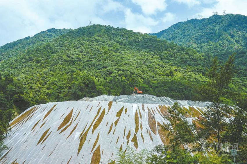 大柏牛棄渣場(chǎng)坡頂、坡面撒的草籽已冒芽,棄渣場(chǎng)看起來綠油油的一片;海子溝棄渣場(chǎng)表面蓋著防止渣土滑落的油布,底部砌起了一堵厚厚的擋墻,為河道讓出空間……