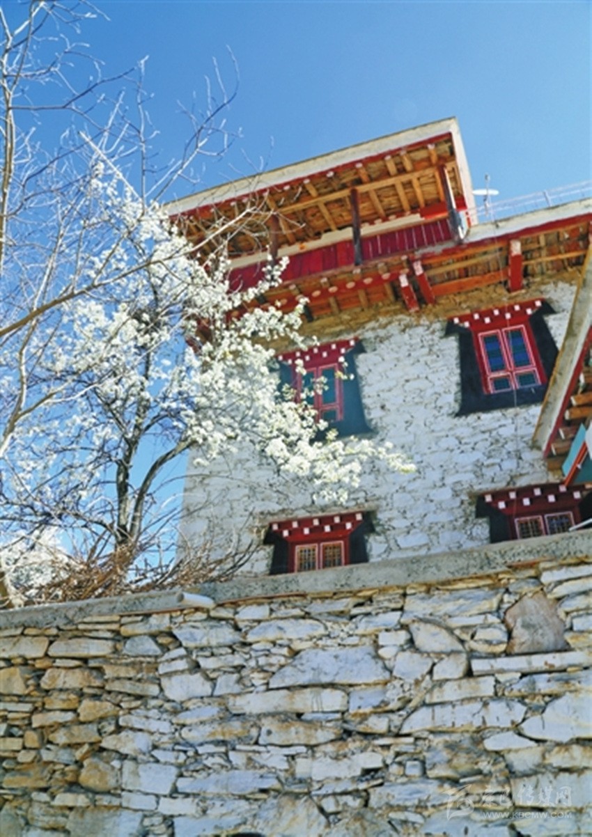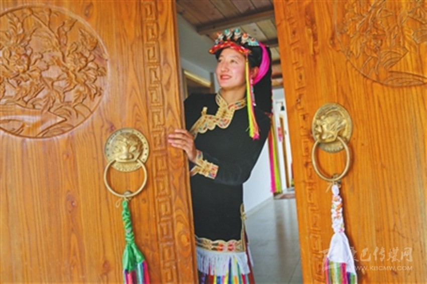 步入藏寨,藏式花紋的窗欞外懸掛著火紅的辣椒和金黃的玉米。朱紅色的大門上刻著藏式圖騰,客廳里色彩鮮艷、雕龍畫鳳的藏式餐桌上則擺滿了當?shù)厥a(chǎn)的時令瓜果。室內(nèi)房間干凈整潔,有寬大的床鋪、客廳和洗手間,手捧香甜的酥油茶,倚窗而立,樹葉隨風擺動,似乎在訴說著少女心中對外面世界的向往。