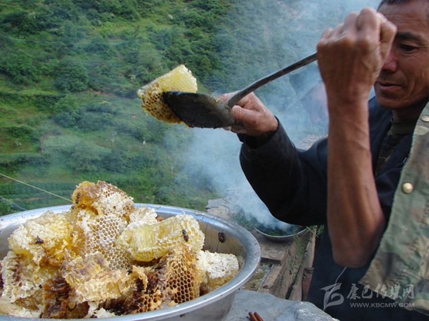 這時(shí)候,一位城里人開(kāi)著車(chē)來(lái)到他家里,前來(lái)購(gòu)買(mǎi)蜂蜜。蘭友才提著火爐,在里面撒上柏樹(shù)枝椏,打開(kāi)蜂箱蓋子后,將煙霧吹進(jìn)蜂箱里。不一會(huì)兒,蜜蜂們紛紛飛出巢穴,在幾十米開(kāi)外不停的飛翔、徘徊,只留下滿箱雪白的蜂蠟一排排整齊的豎立在那里。蘭友才拿出一把刀,輕輕地在蜂蠟上割取,并迅速將浸滿琥珀色糖液的蜂蠟放進(jìn)瓷盆里。蘭友才告訴我,蜂蠟的上半部分為蜂蜜,下半部分是蜂蛹的巢穴,因此只割取上半部分。