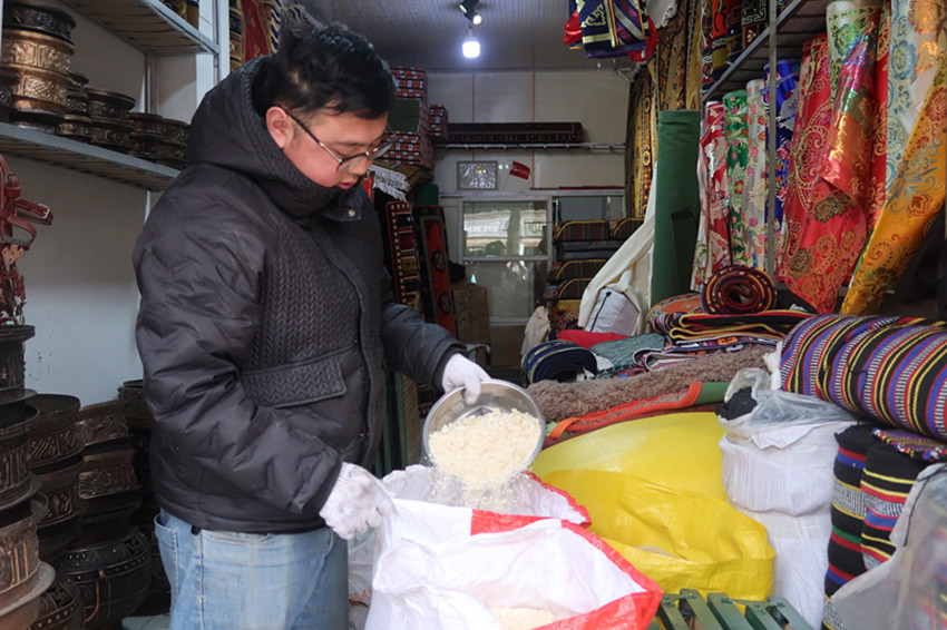這個30多平方米的商鋪內(nèi)人頭攢動,地毯、布料、銅鍋……各種物品應(yīng)有盡有?!疤鹤佑昧舜蟀肽炅耍|(zhì)量還是這么好,不僅沒變形,顏色還是那么鮮艷,所以今天專門來再買一個拿回家備用。”客人尼瑪說。