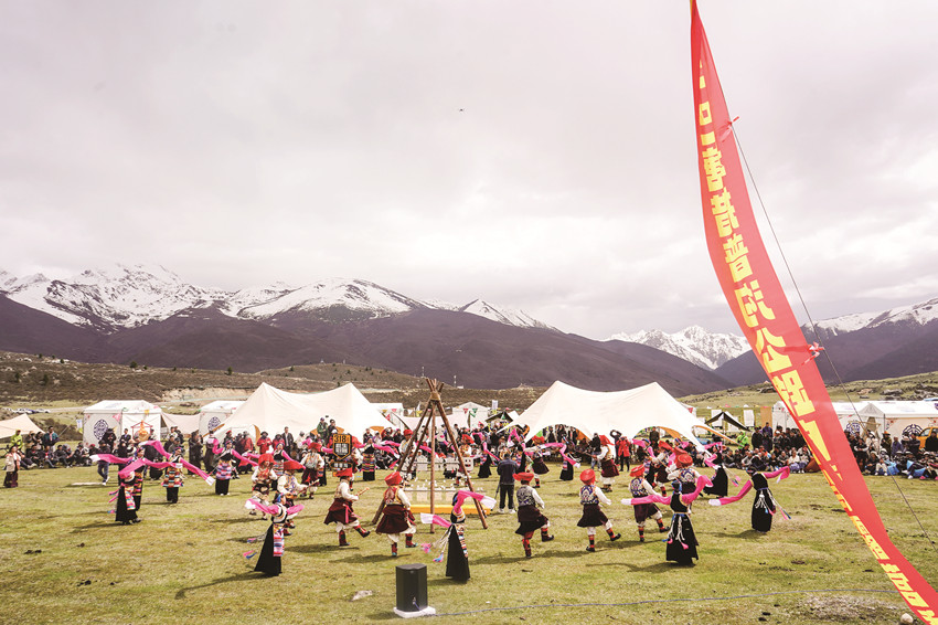 皚皚雪山相伴,莽莽森林環(huán)繞,措普湖猶如一面鏡子靜靜地躺在雪山下。湖邊草地上歡快的人們,或手拉手,跟著弦音學(xué)習(xí)巴塘舞蹈,或手捧一杯藏式奶茶,躺在沙發(fā)上,享受悠閑時光。