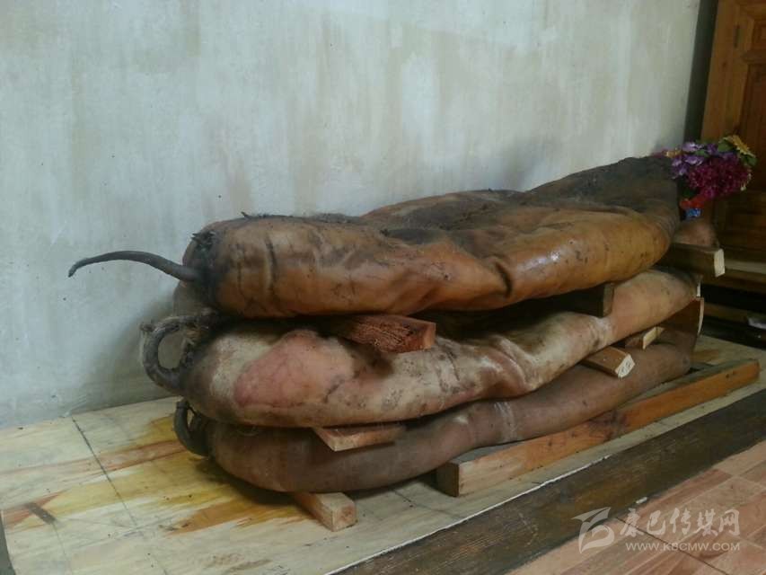 半干豬肉:在丹巴縣革什扎鄉(xiāng)有一種比較奇特的豬肉保存方法:將豬殺死后,不去毛,只在豬的腹部開一條口子取出內(nèi)臟,將血水清理干凈后用麻繩將腹部縫合。隨后用當?shù)氐狞S泥漿敷在豬身上,在豬的身上形成一個厚約2厘米的殼,密不透風。處理好后將其懸掛于灶塘之上,使黃泥在高溫的烘烤下快速硬化。如若發(fā)現(xiàn)黃泥層出現(xiàn)裂縫,立即用黃泥漿將其修復(fù)。等到第二年熱天時,敲掉黃泥形成的硬殼,豬毛被輕松退去,豬肉依然比較新鮮。但這種保存新鮮豬肉的方法現(xiàn)在已經(jīng)很少見了,一是因為這種保存方法風險太大,稍有不慎豬肉就可能腐敗;二是如今物資供應(yīng)豐富,新鮮豬肉購買方便,使得此種儲存方式失去了存在的價值。